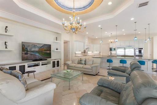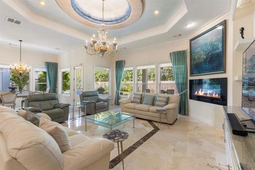 Spanning 6,297 SF, this custom estate offers a sophisticated blend of elegance & functionality with 5/6 bedrooms, 4 full & 2 half baths. Outside, a stucco & Poloverdi natural stone exterior, lush landscaping, & a wrought-iron gate open to a porte-cochere & air-conditioned three-car garage equipped w/ a sink & workstation. Thoughtfully designed for effortless living w/ comfortables 11-12" ceilings. Inside, rich marble & wood floors, quartzite countertops, & cove lighting welcome all. The main level features two primary suites & an option for a 3rd, along with a media room, private office, & a flexible space for a craft room or gym. The chef's kitchen boasts 2 islands, 2 lg sinks & high-end appliances, seamlessly connecting to an inviting living area. Upstairs: 3 add'l bedrooms, 2 w/ ensuite baths, a game room & wet bar. Outdoor living enjoys a pool/spa, kitchen, fire pit, & 3 balconies. Add'l highlights: whole-home water filtration, a whole-house generator, & 2 reverse osmosis system.
