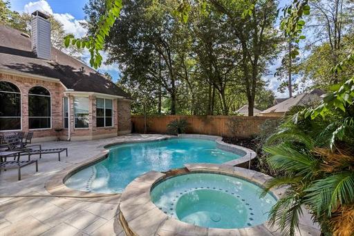 Welcome to this fabulous David Weekley home in The Woodlands' highly sought-after Village of Alden Bridge, just a short walk to highly acclaimed Buckalew Elementary and zoned to TWHS. Set on a private cul-de-sac, this home is ready for you to add your personal touch to make it your own. The backyard features a patio, pool, and spa. Inside, an elegant foyer with high ceilings and a graceful staircase welcomes you into a versatile floorplan. The layout includes a home office with front yard views. Surrounding the kitchen is a formal dining room, a sunroom, a breakfast room, and a family room with a cozy fireplace. The first-floor primary suite features a seating area overlooking the pool/spa, while upstairs, a spacious playroom, an oversized bedroom with its own bath, and two additional bedrooms connected by a Jack-and-Jill bath provide ample space. An extended front porch and lush yard offer added privacy and ideal entertainment space. Ready for new owners to call it HOME!